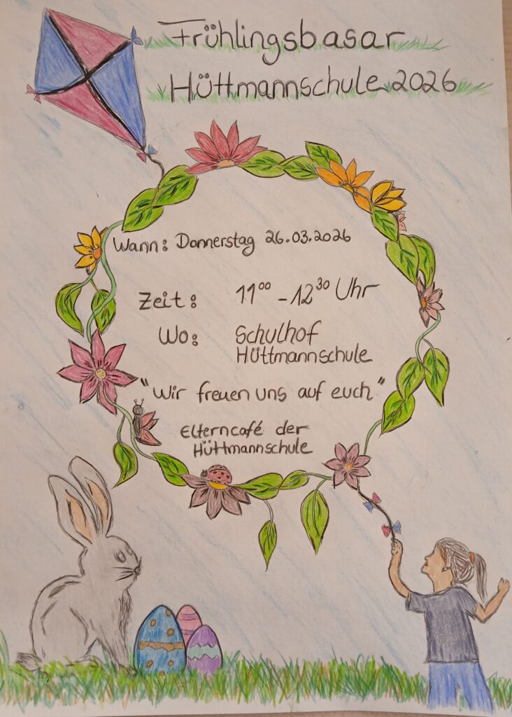 Am 26.03.2026 findet auf dem Schulhof der Hüttmannschule ein Frühlingsbasar statt. Organiseirt und umgesetzt wird dies durch das Elterncafé der Hüttmannschule.